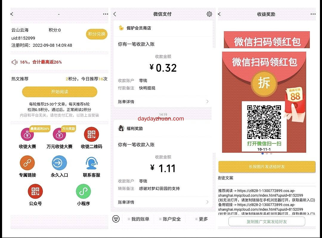 和之前的云扫码模式一样,0.3可提现,这个是一次阅读2积分,100积分=1元。然后又有一些具体要求,每天30×6=180,360积分=3.6元。也就是说稳一点的话是每天3.6元 这类项目无需投资,可以放心使用。。。 上次云扫码链接如下http://www.daydayzhuan.com/article/12937