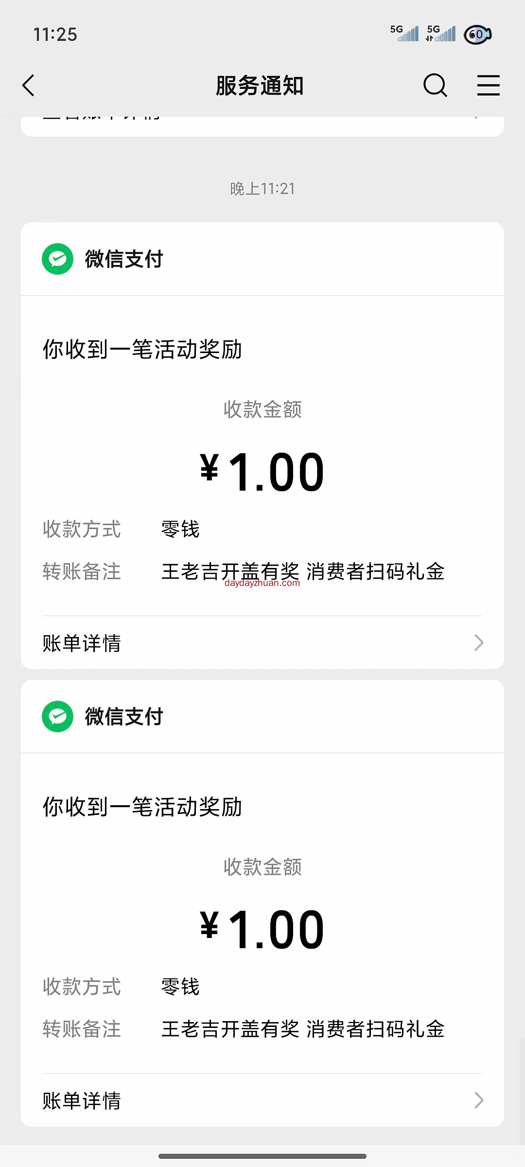 这次是王老吉开盖有奖,每天买5个码,成本0.77元,可以撸2~6元,非必中但是概率挺大的,利润在1.3~5.3元左右,玩法跟康师傅瓶盖一样,天天线报网的赚友赶紧上吧。